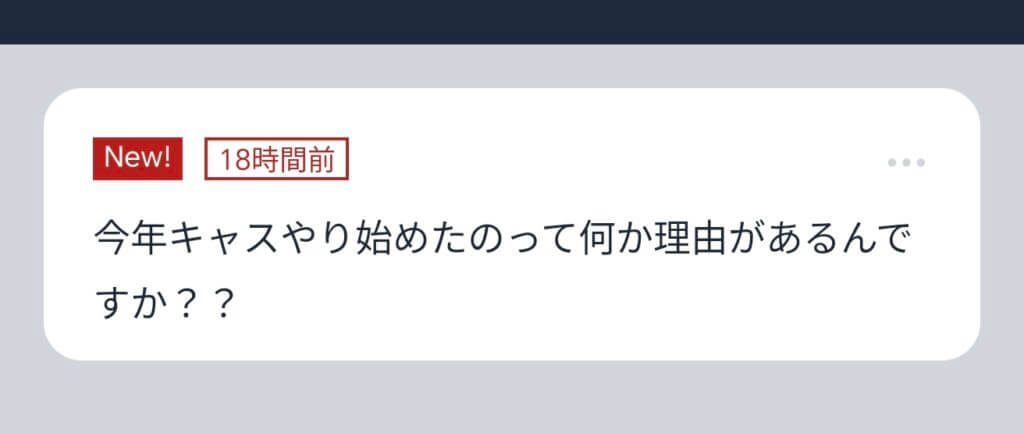 なんでキャス始めたのーって質問が来た時の回答日記ですね。懐かしい。 ↓↓↓ 質問ありがとうございます。自戒の意味も込めて日記で回答します。 質問:今年キャスやり始めたのって何か理由があるんですか?? 回答:ありますあります、ありますよ~。 まず、入店してキャスを知った時からずっとやりたいとは思ってたんです。キャスやってたらな...