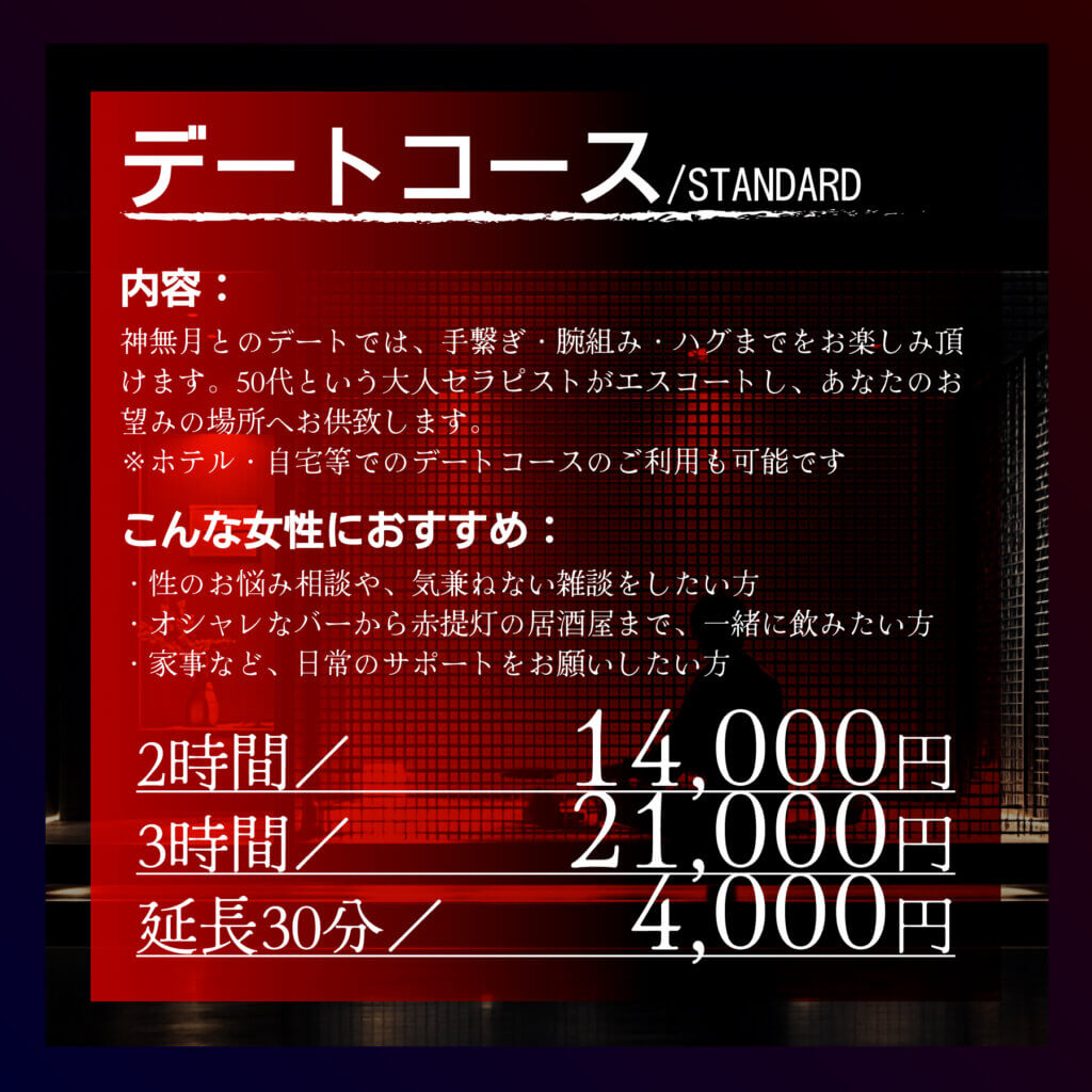2神無月とのデートでは、手繋ぎ・腕組み・ハグまでをお楽しみ頂けます。50代という大人セラピストがエスコートし、あなたのお望みの場所へお供致します。