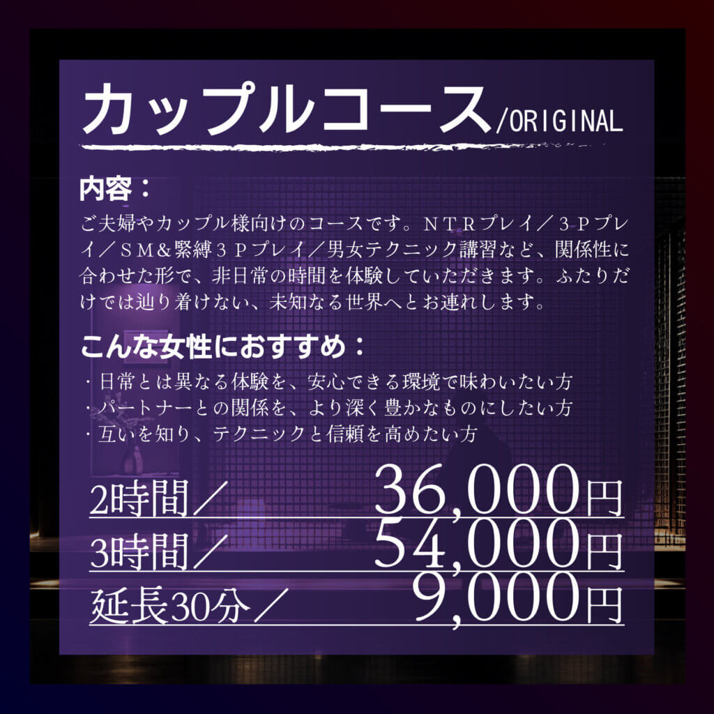 ご夫婦やカップル様向けのコースです。NTRプレイ/3Pプレイ/SM&緊縛3Pプレイ/男女テクニック講習など、関係性に合わせた形で、非日常の時間を体験していただきます。