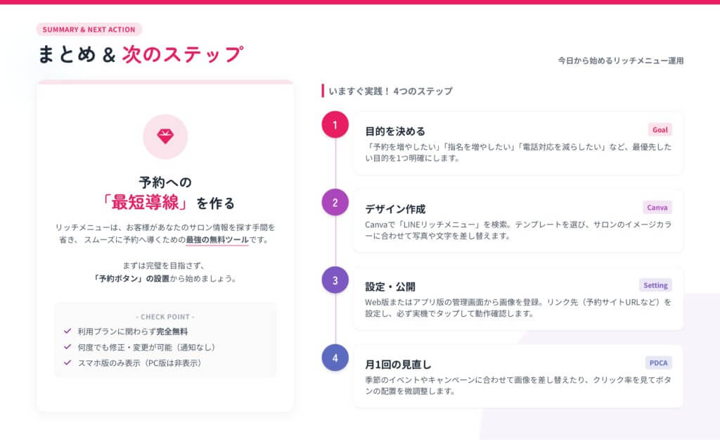 リッチメニューは、LINE公式アカウントを運用するセラピストにとって強力な武器になります。設定のポイントをおさらいしましょう。
