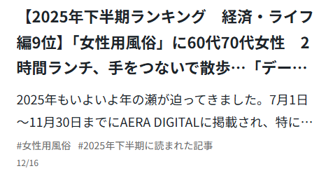 参考:【2025年下半期ランキング 経済・ライフ編9位】「女性用風俗」に60代70代女性 2時間ランチ、手をつないで散歩…「デート」に救いを求める女たちの“孤独と不安”